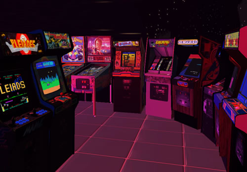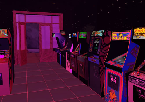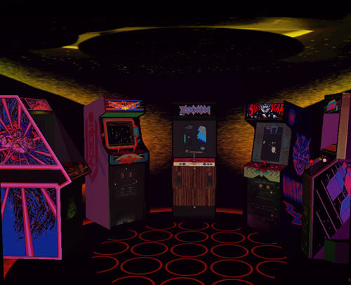 A multi-level arcade environment connected with buildings connected by aerial walkways.
